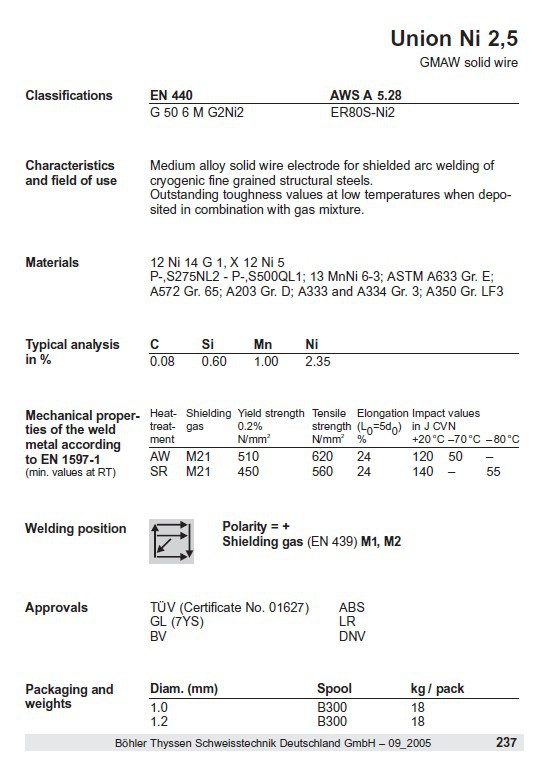 德國蒂森Union Ni 2,5焊絲ER80S-NI2焊絲
